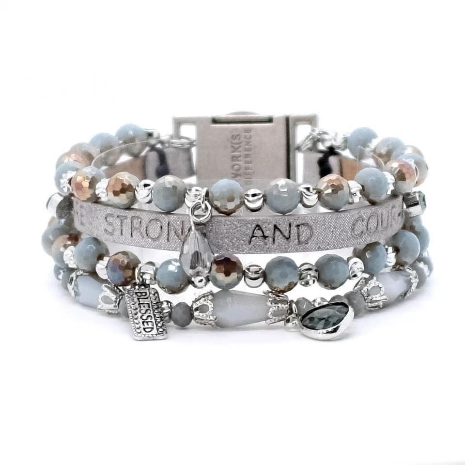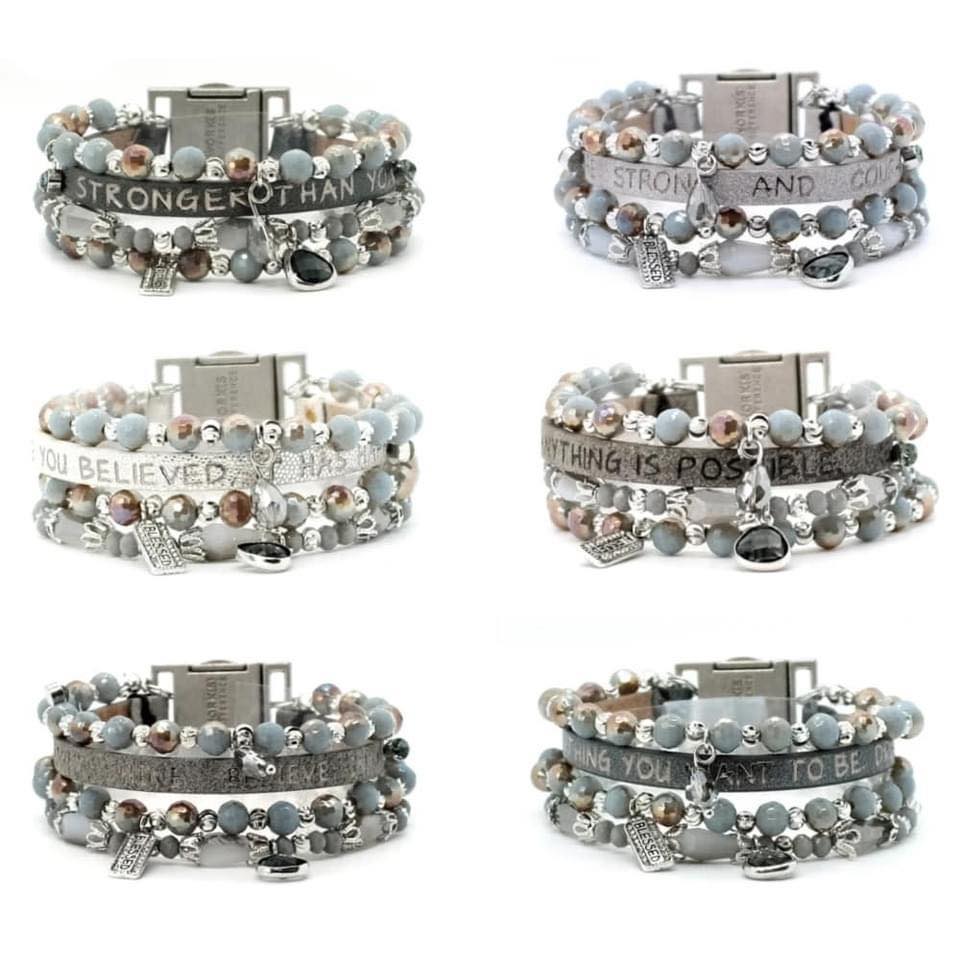 Strand 4: Teardrop shaped stone beads accented by silver beads, with double sided blessed charm and glass crystal drop trim.