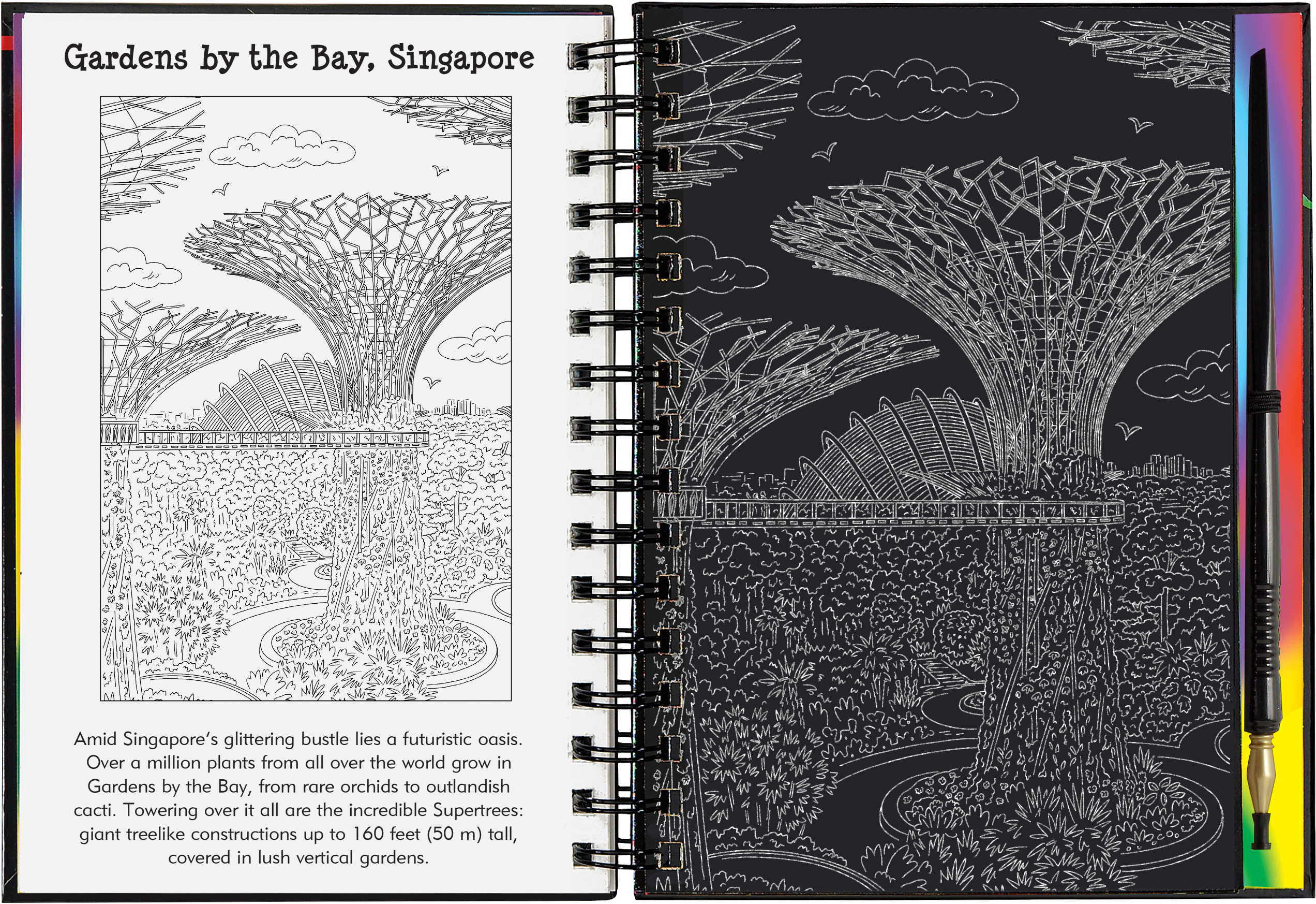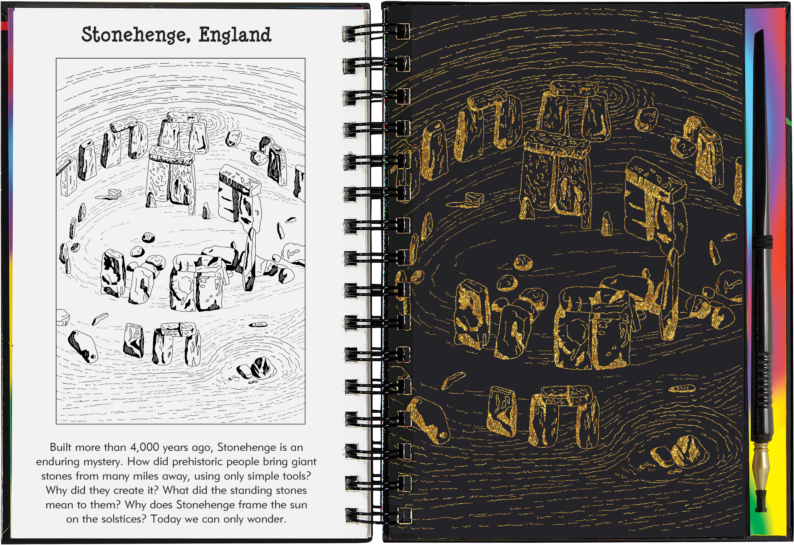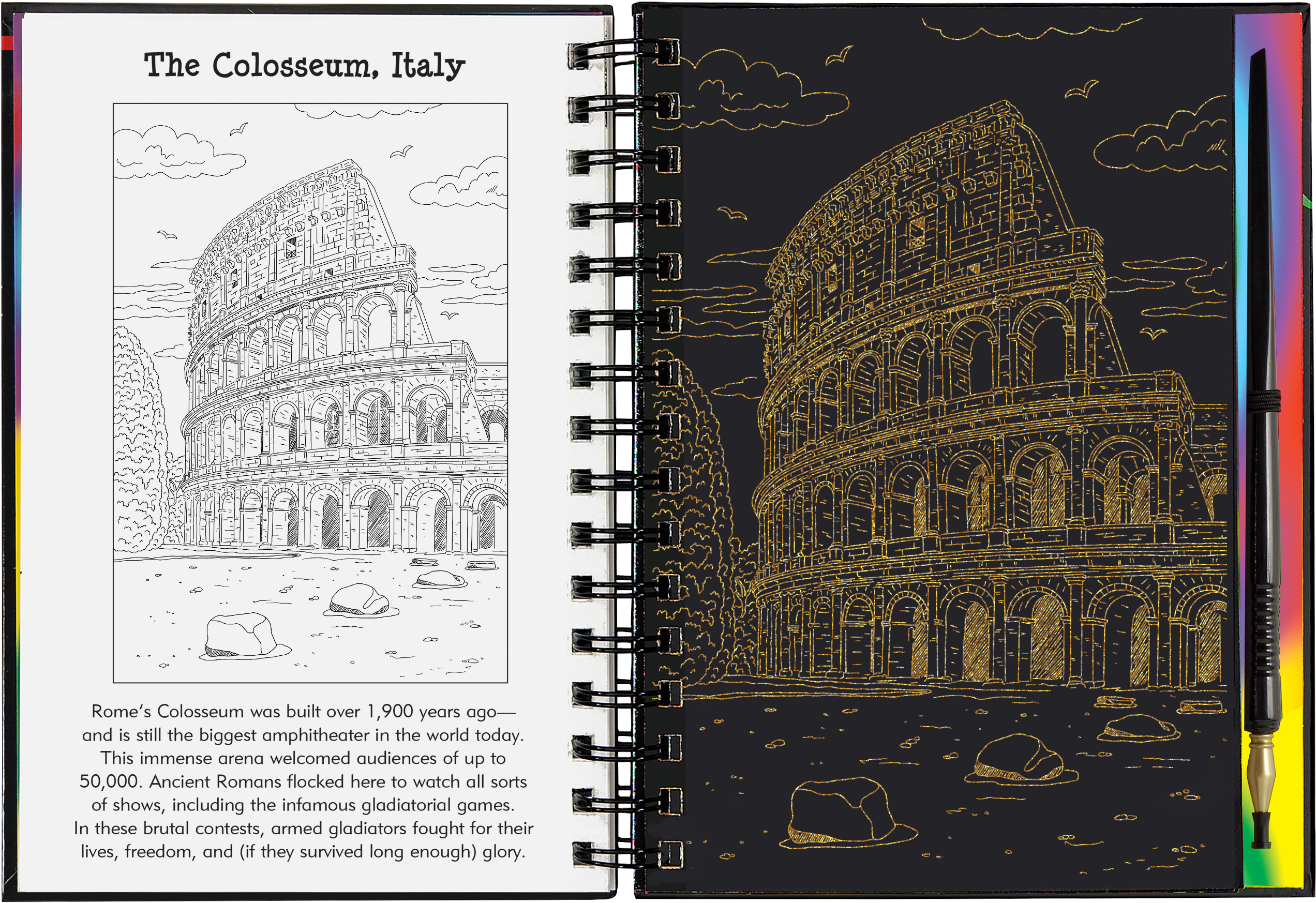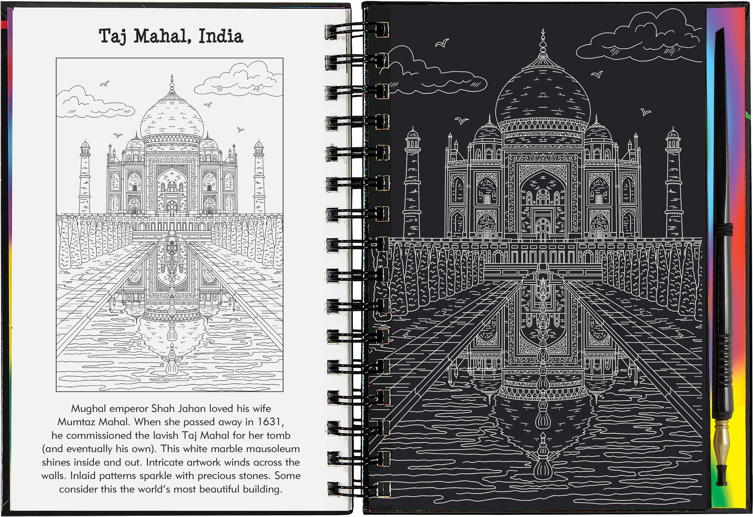 • Art activity book includes 20 gold or silver scratch pages; 20 world-wonder images to color and trace, with facts about each location; 20 extra pages for your own independent drawing and sketching; and a special fine-line stylus to bring each wonder to life!