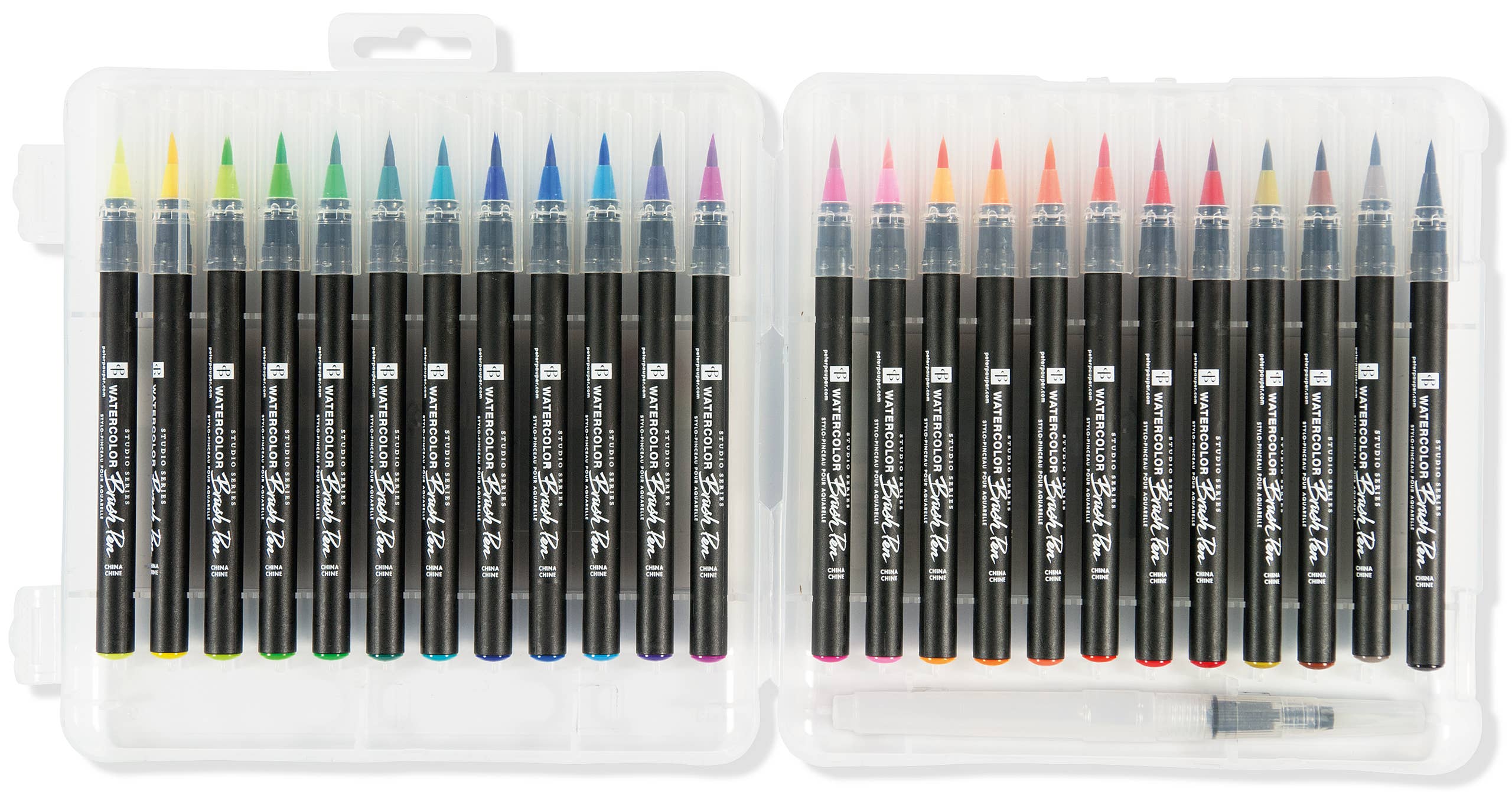 Create gorgeous watercolor effects with this bristle brush pen set! Vivid colors blend beautifully, by themselves or with water from the included water brush. Perfect for painting, brush lettering, coloring, sketching, and more. 24 colors. Fine nylon bristle tips. Set includes 1 water brush for blending. Sturdy reusable plastic case keeps pens safe and organized. Case measures 7-1/4'' wide x 7-1/4'' high.