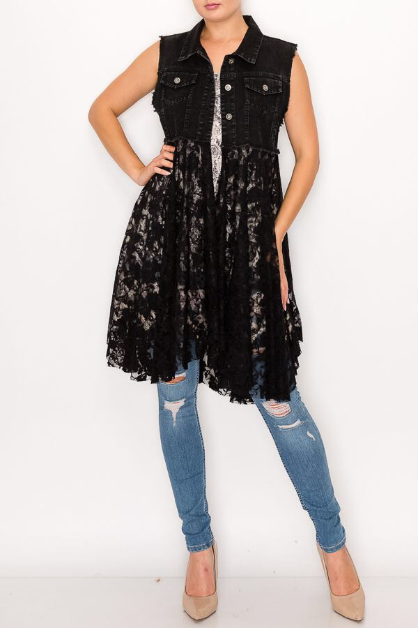 Experience the unique blend of style and comfort with this Black Denim Vest from Origami Apparel. The vest features a delicate lace layer, adding a touch of femininity to the classic denim design. Ideal for a casual day out or a night on the town, this vest is a versatile addition to any wardrobe. Inspired by lace and crochet trends, it's a stylish piece that complements a wide range of outfits. Enhance your style quotient with this chic and trendy outerwear vest.
