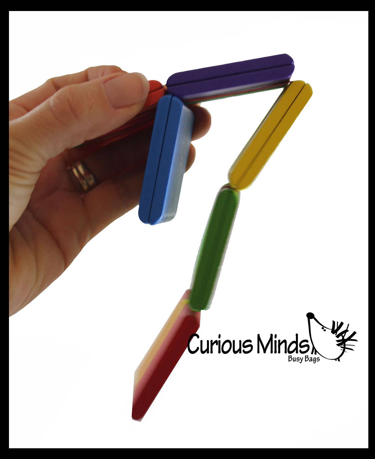 Jacob's ladders are a classic wooden fidget toy that is made up of colorful square blocks that are held together by ribbons. If you hold the top block and wiggle your wrist you can put the block in motion. It will look like it is clanking down itself and it makes a soft noise as the blocks hit together. This effect is an illusion that is the result of one block after another flipping over. To set the toy in motion, hold the top block with the single ribbon facing outward. Rotate the wrist forward and backward and watch the blocks fall. Each wood square is 2", and it is 12" long.