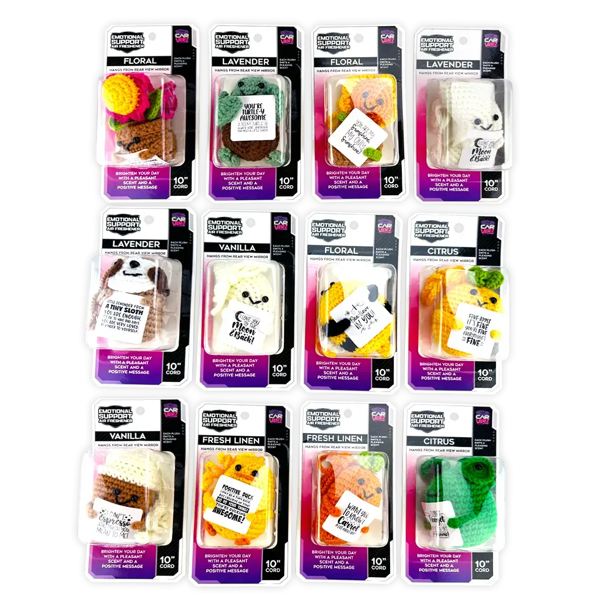 Add a touch of comfort and freshness to your car with these Emotional Support Air Fresheners. Each plush hangs conveniently from your rearview mirror, releasing a pleasing scent that uplifts your mood. With a positive message on every piece, they brighten your day while keeping your space smelling delightful. Perfect for daily encouragement and a refreshing drive!
