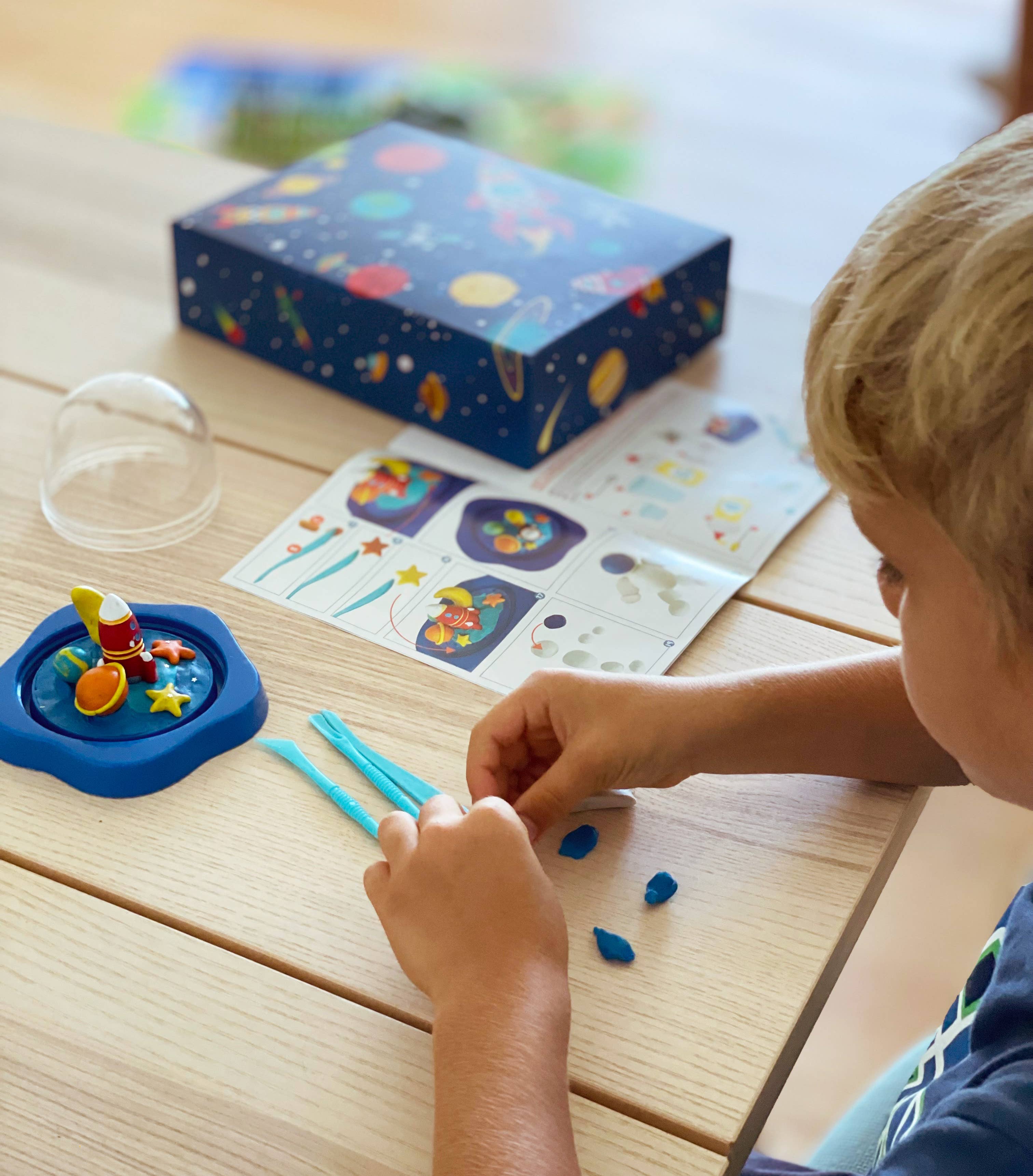 modeling clay to create an astronaut, moon, planets and stars, and arrange them
