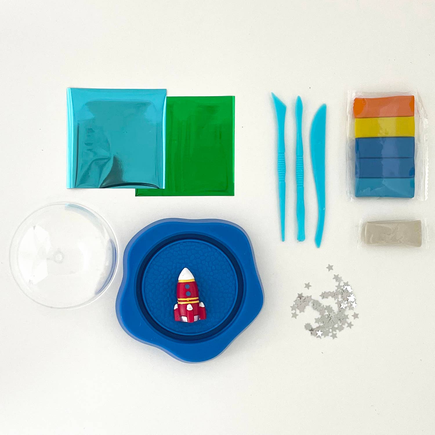 Includes: 1 (2-piece) globe with base, 1 rocket figure, 6 sticks of modeling clay, 3