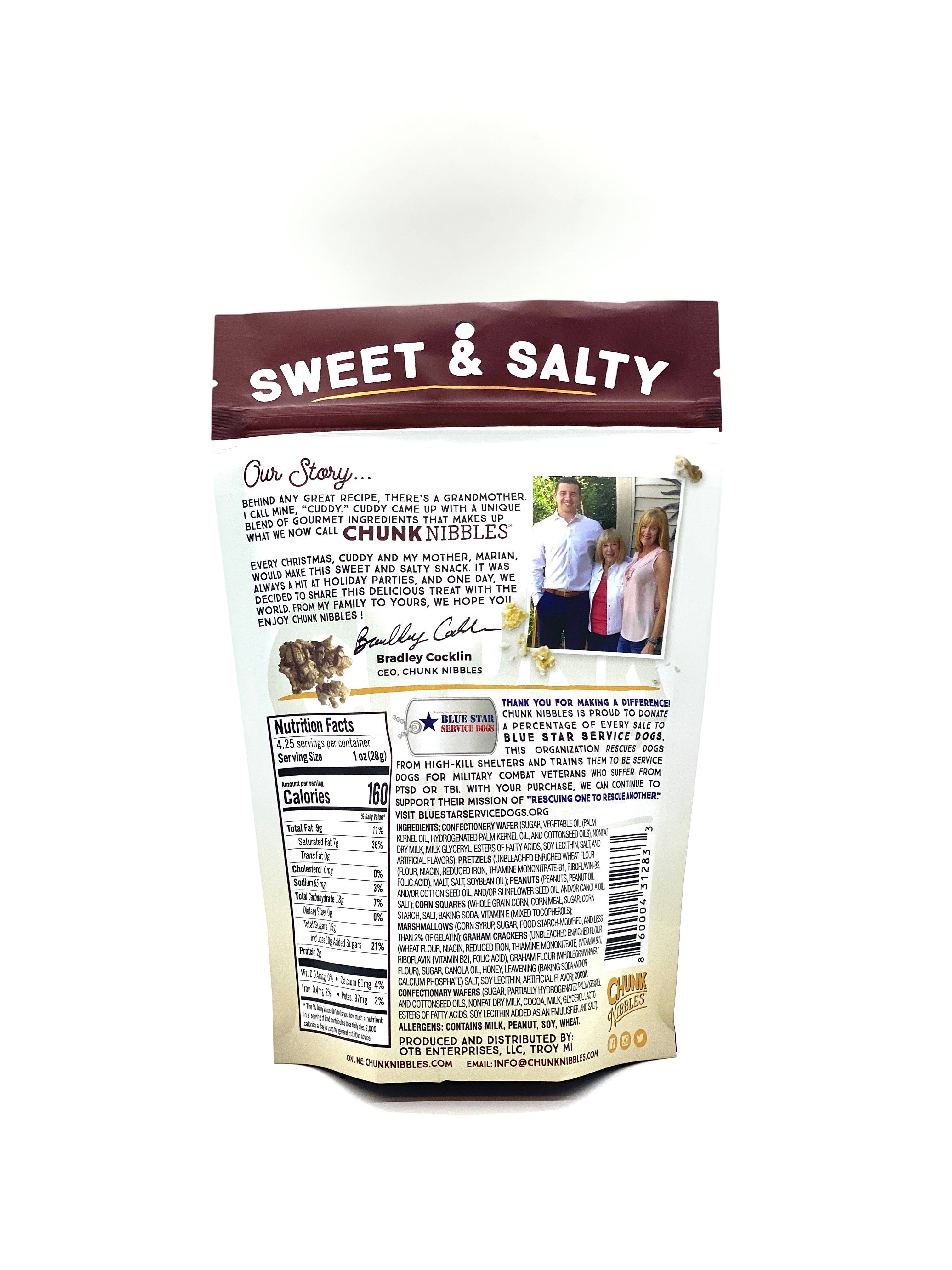 Immerse yourself in the nostalgic charm of our S'MORES flavor. Everyone’s favorite campfire treat, without the mess! Our light coating seamlessly unites real graham crackers, miniature marshmallows, salty peanuts, crunchy pretzels, and corn squares. Topped off with a delicious chocolate drizzle prompting an immediate desire for ‘s’more’ with every luscious bite.