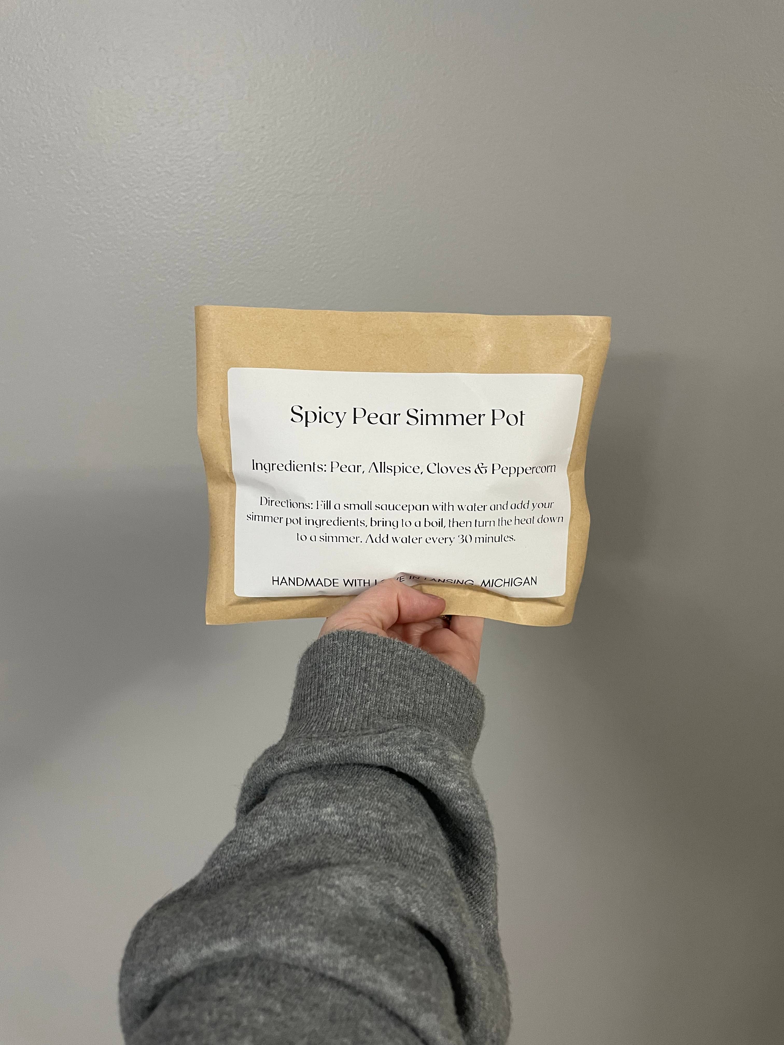 All natural simmer pot packs to meet any scent desires! Perfect for gift baskets for new homes, patients or colleagues. Holiday Cheer (Apple, Orange, Cranberry & Cinnamon) Serenity (lemon, eucalyptus, and salt) citrus bliss (lemon, lime, orange, mint + thyme) Lemon Basil Breeze (lemon,basil, vanilla + rosemary) Apple Spice (Apple and Cinnamon) Warm Hugs (Orange and Cinnamon) Home Cleanse (Cranberry, Rosemary, Cloves, Lemon, Orange, Apple, Cinnamon and Salt) Protection (Peppercorn, Rosemary, Clove, Salt, Bay leaf, Cranberry, Lime & Cinnamon) Abundance (Apple, Orange, Clove, Cinnamon, Rosemary & Bay Leaf) Happiness (Lemon, Rosemary & Lavender) Spicy Pear-Pear, Allspice, Cloves & Peppercorn Fresh & Clean- Grapefruit, Lime, Lemon, Orange, Peppercorn, Salt & Bay leaf Williams Scent- Peppercorn, Lemon, Vanilla Salt & Rosemary Lemongrass Dream-Lemon, Lime, Lemongrass+ Vanilla Salt Contents may vary.